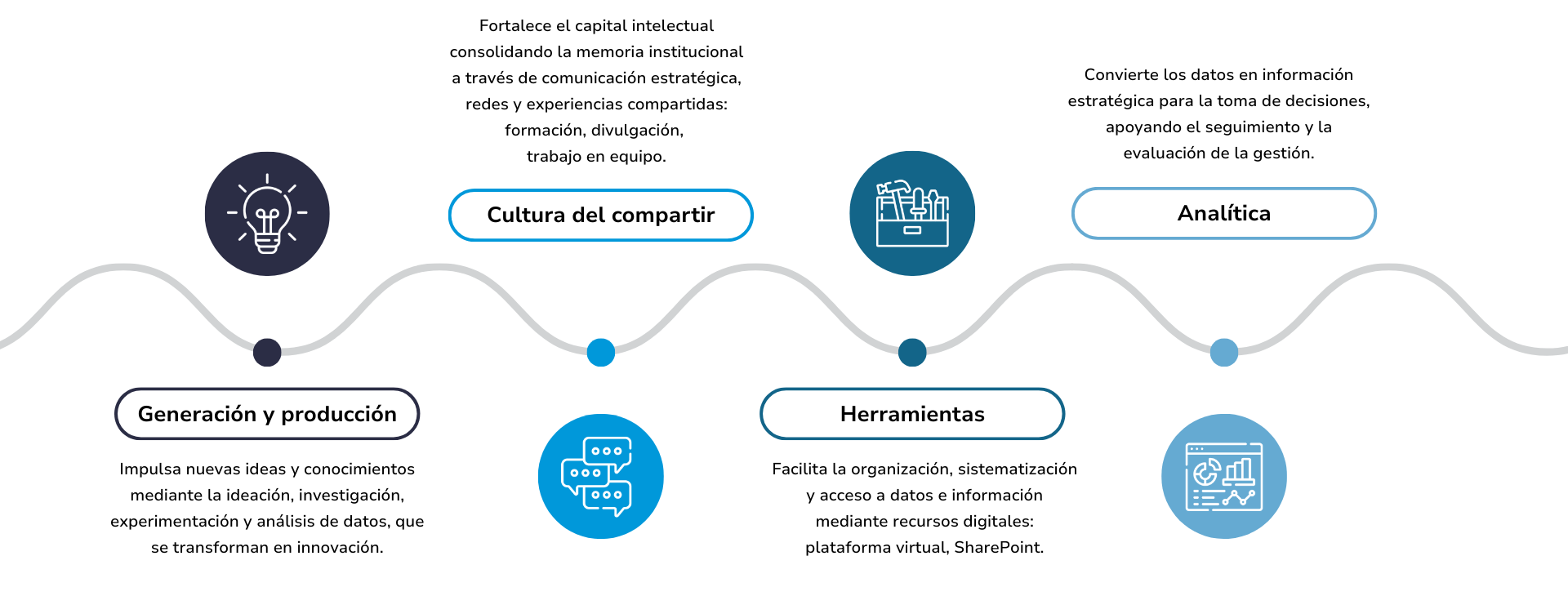 Es el proceso mediante el cual se implementan acciones, mecanismos o instrumentos orientados a generar, identificar, capturar, valorar, transferir, apropiar, analizar, difundir, preservar y explotar el conocimiento de las entidades públicas, con el fin de fortalecer la gestión, facilitar procesos de innovación y mejorar la prestación de bienes y servicios (DAFP, 2020). ¿Cuáles son los ejes de la gestión del conocimiento?